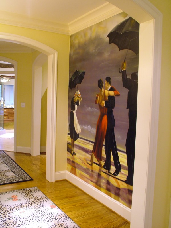 Hand painted mural on canvas for a private residence in Great Falls VA. This mural of The Singing Butler is a copy of one of Jack Vettriano’s great works of art. Client wanted to surprise her husband with this because it was a anniversary gift from him years ago- The surprise was to make it a larger scale. This image really transformed the hallway in the Reserves of McLean VA. Property of blue line studios. Artist; John Kiernan- 703-618-9090 www.bluelinestudios1.com